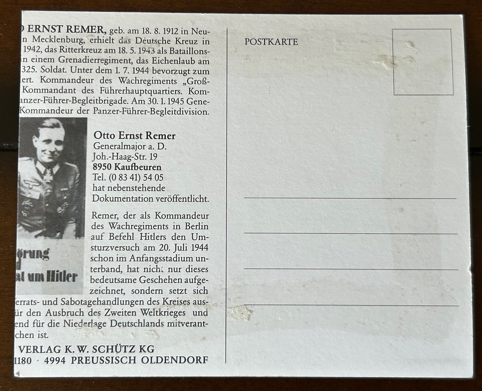 Autographed photo - General Remer, July 20th plot officer