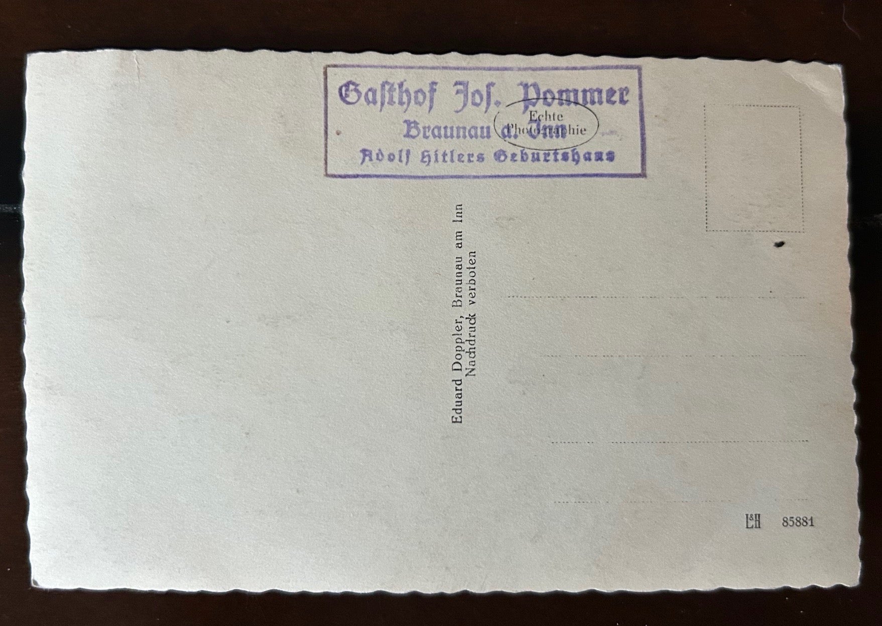 Third Reich era photo postcard of Hitler’s birth place in the Austrian town of Braunau am Inn (Adolf Hitlers Geburtshaus). The reverse has a commemorative period stamp on it, indicating that the building was an inn at the time. Hasn’t been mailed or filled-in.