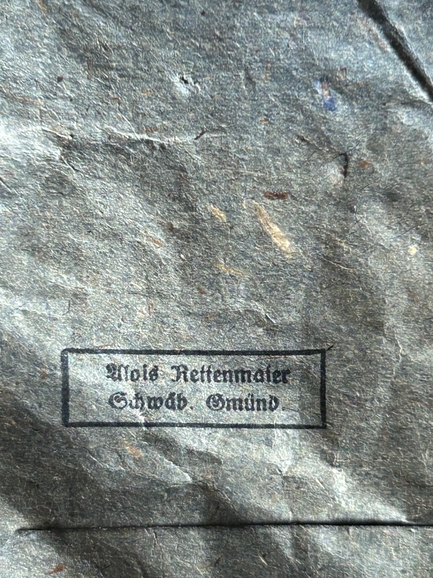 WW2 period Iron Cross 2nd Class issue envelope, the marker indicated on the reverse is “Alois Rettenmaier, Schwäb. Gmünd” (the Iron Cross in this envelope would have been marked “16” on its ring). Shows typical age and wear, but no tears or holes.
