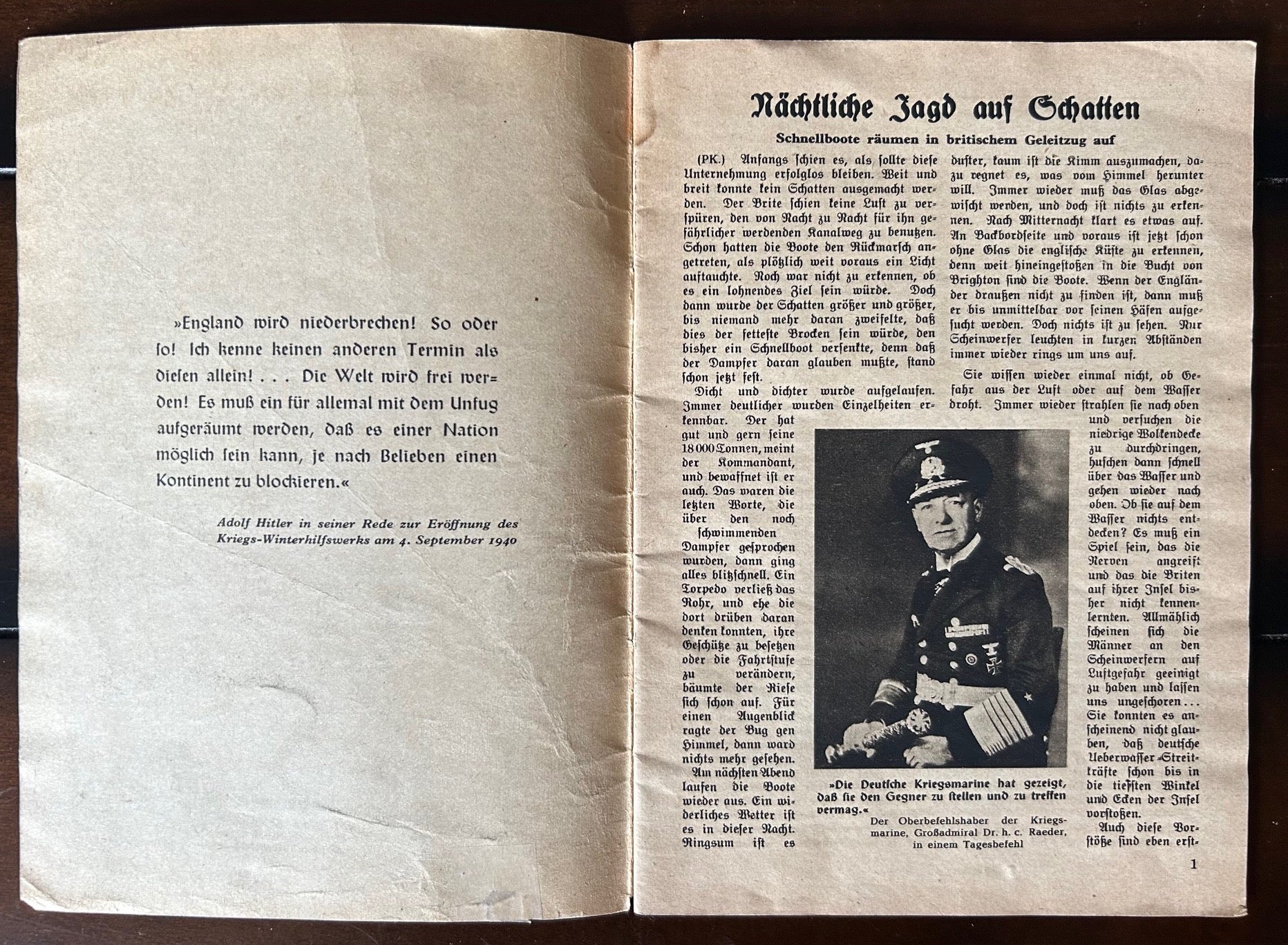 WW2 German booklet, number 7 in the Kleine Kriegshefte series, entitled Ran an den Feind! Kampfberichte von unserer Kriegsmarine (Run towards the enemy, battle reports from our navy). Softcover, 32 pages of text and images recounting battle action of German submarines and surface ships from 1939 to 1940. In good condition.