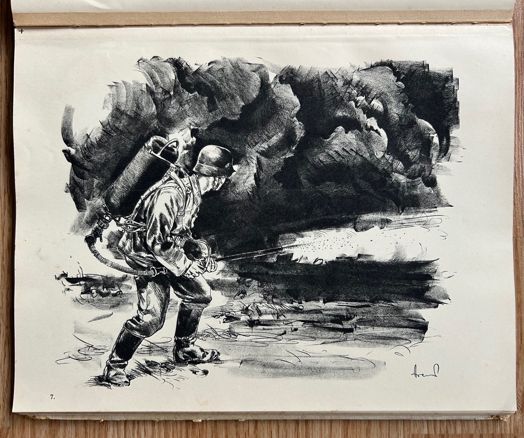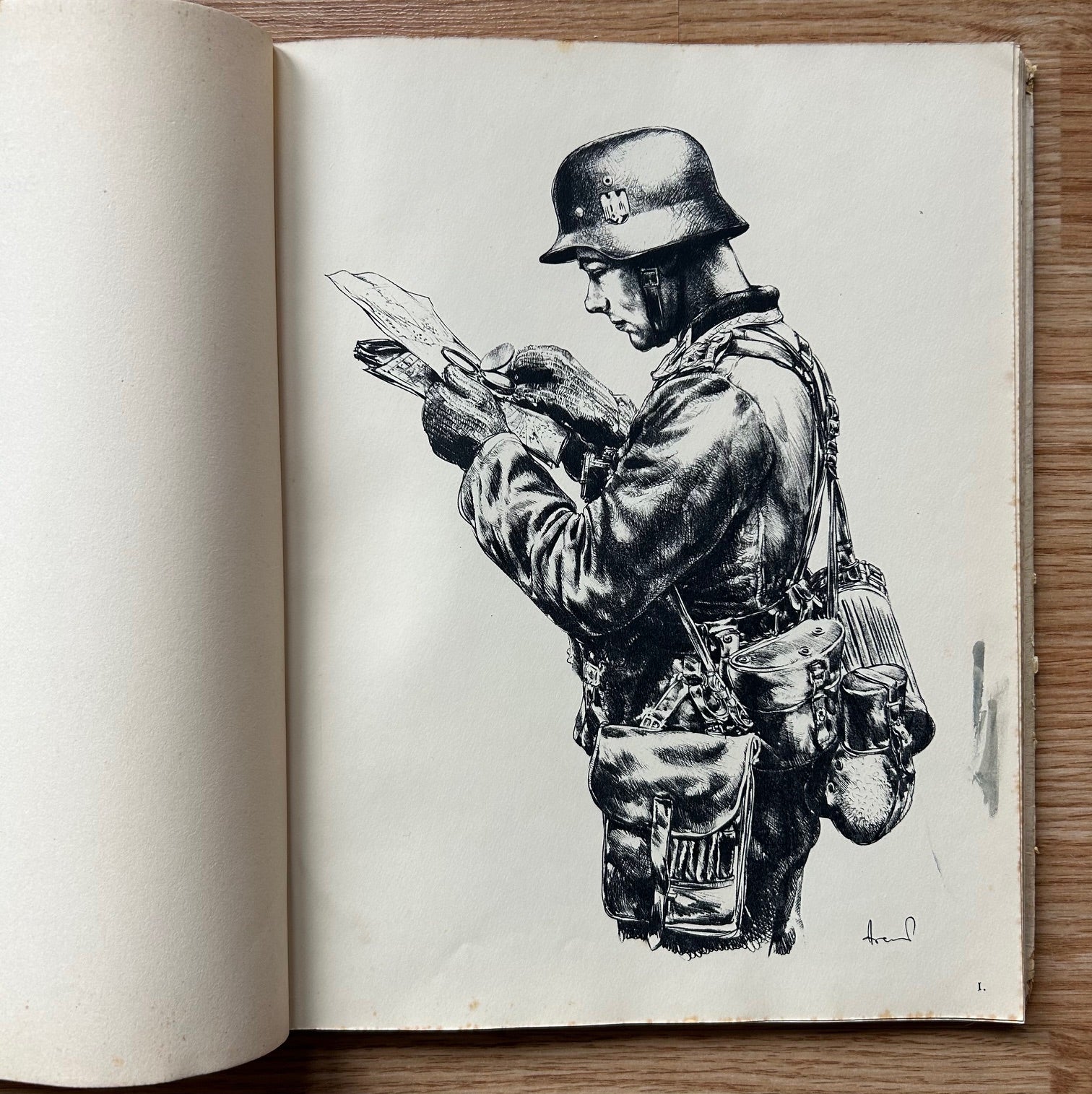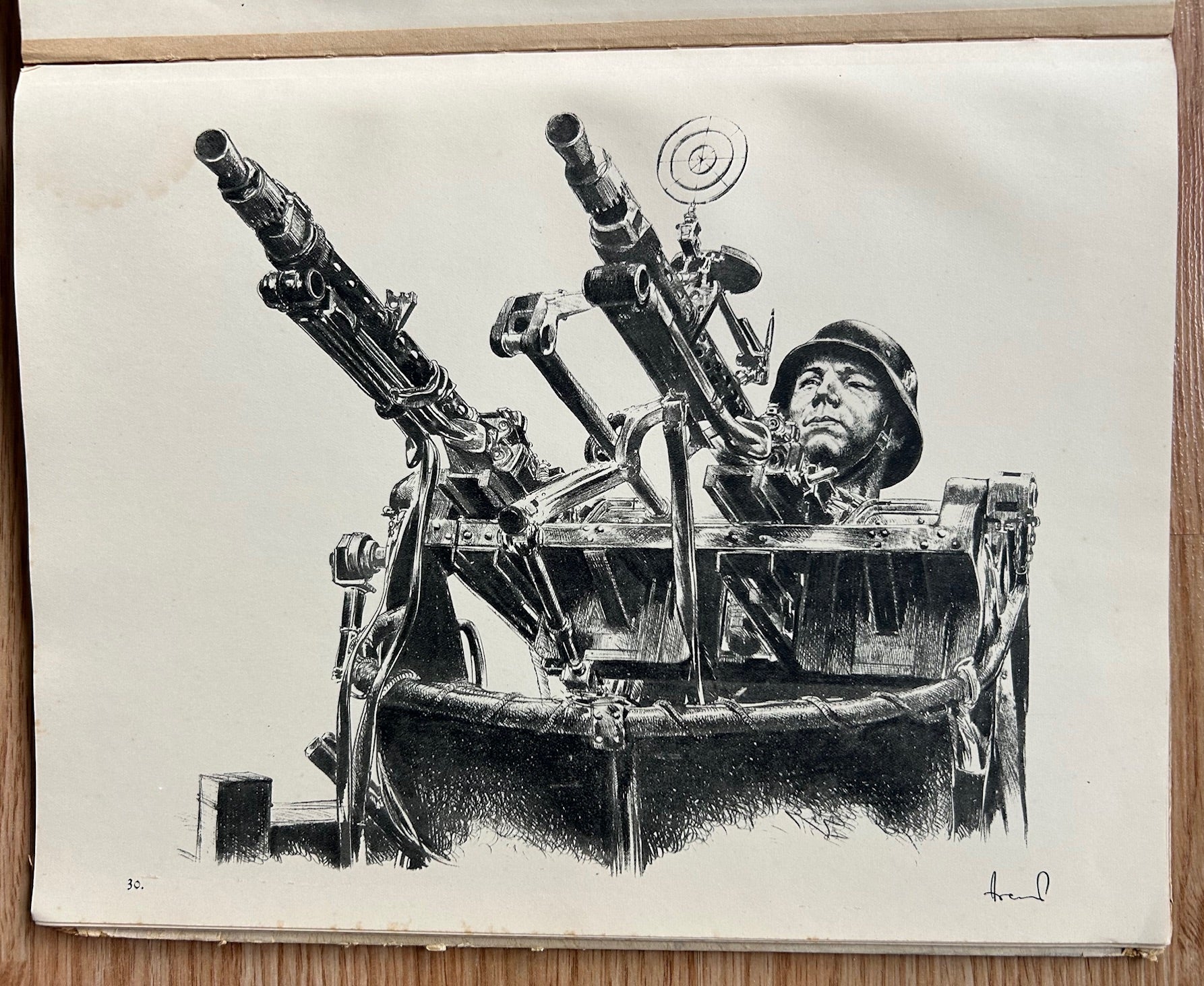 Männer und Waffen des Deutschen Heeres, hardcover book of prints drawn by artist Josef Ahrens, who accompanied Field Marshal List’s armies in the field. 45 pages of text and 40 pages of prints, depicting a wide array of weaponry and equipment used by the Wehrmacht. Short foreword written by Field Marshal List, with his facsimile signature. The cover shows some wear and age, but the spine is in decent shape and there are no missing or damaged pages.