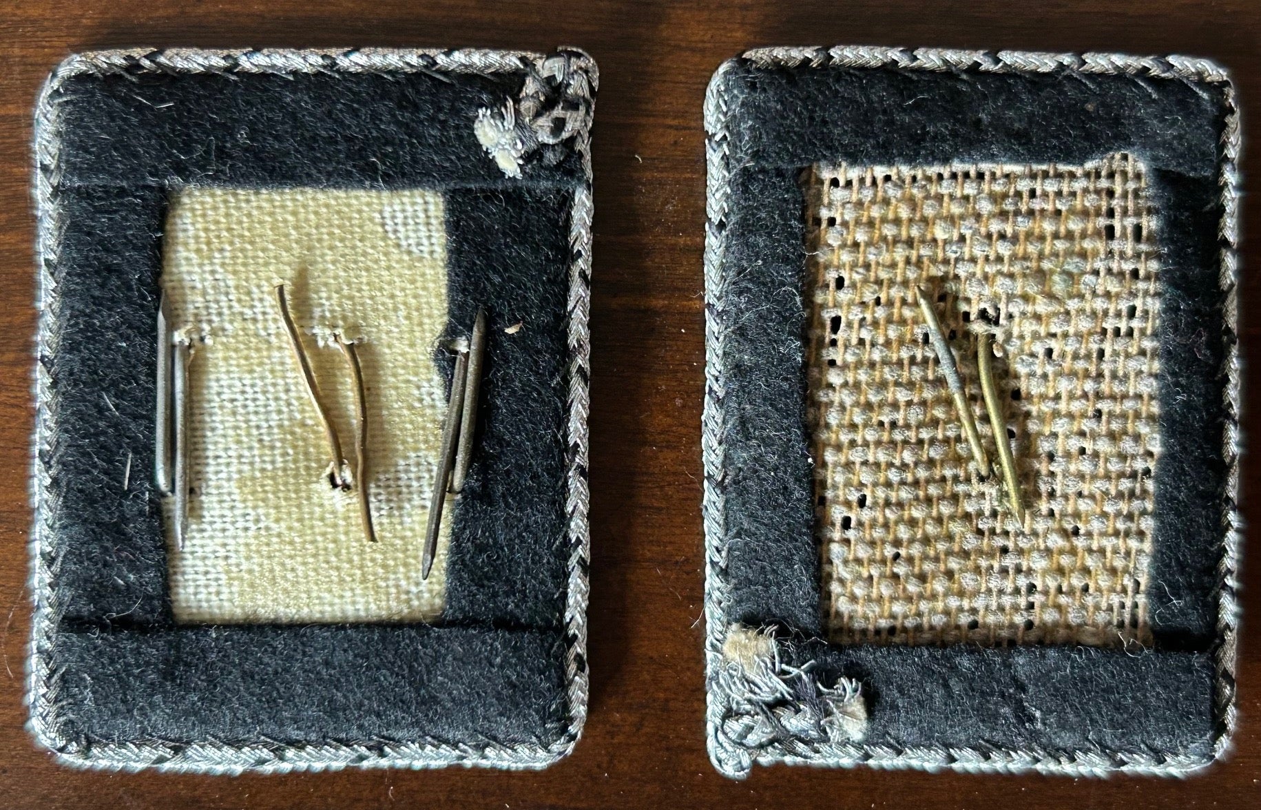 Pair of 1940 pattern TeNo (Technische Nothilfe) collar tabs. The cogwheel cypher indicates that this would have been worn by an enlisted man / NCO between the rank of TeNo Mann and Obervormann. The numerals cyphers “134” would indicate the local Ortsgruppe that this TeNo member belonged to (unknown, haven't been able to discover it through research). In very good condition, fairly rare item, they don’t come up very often.