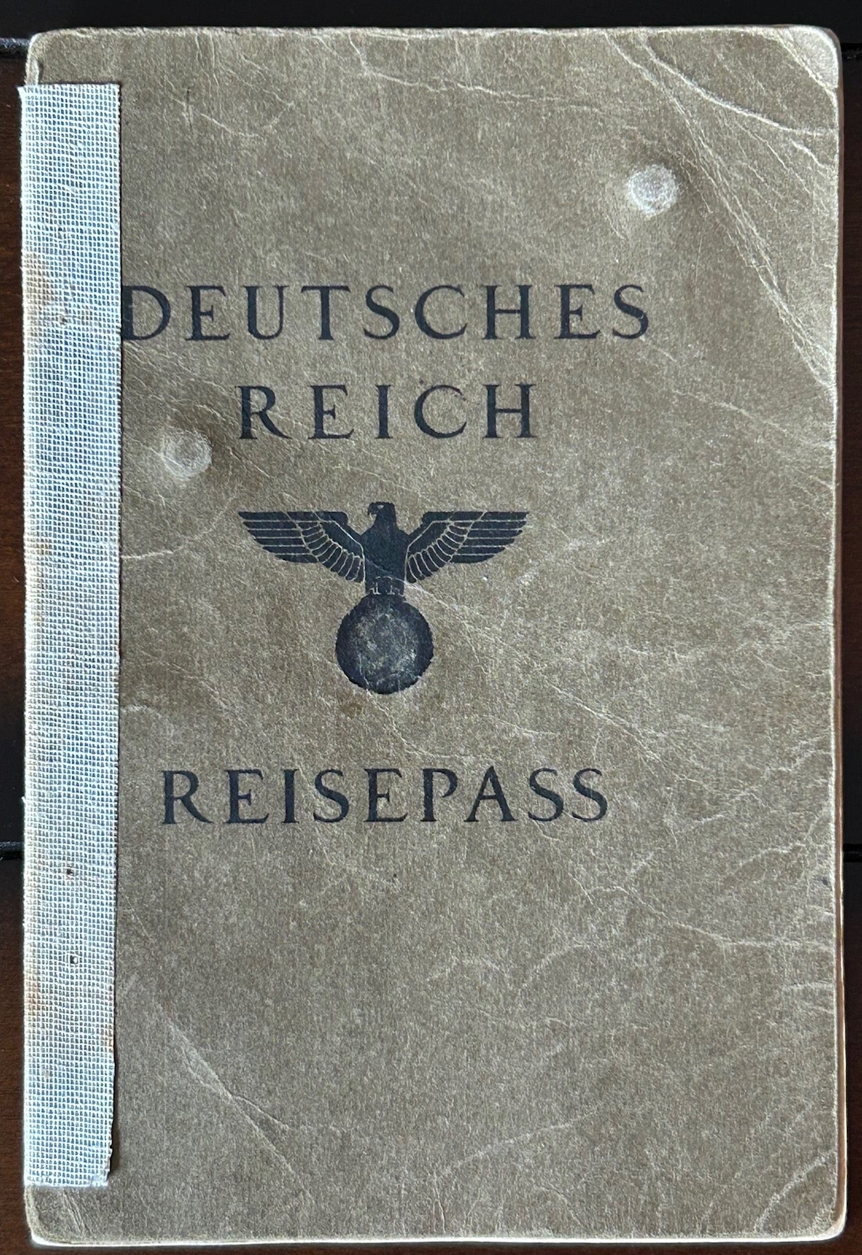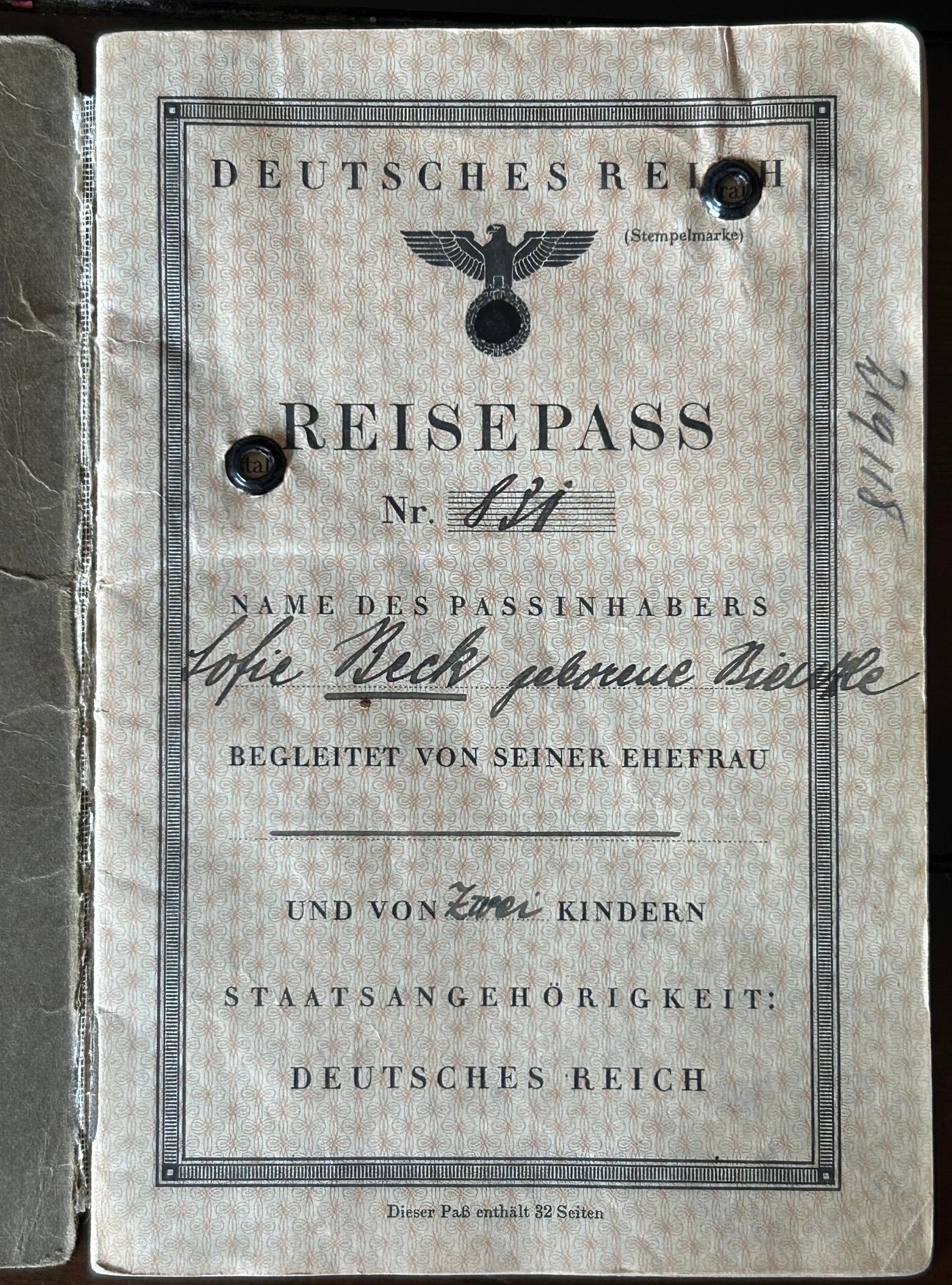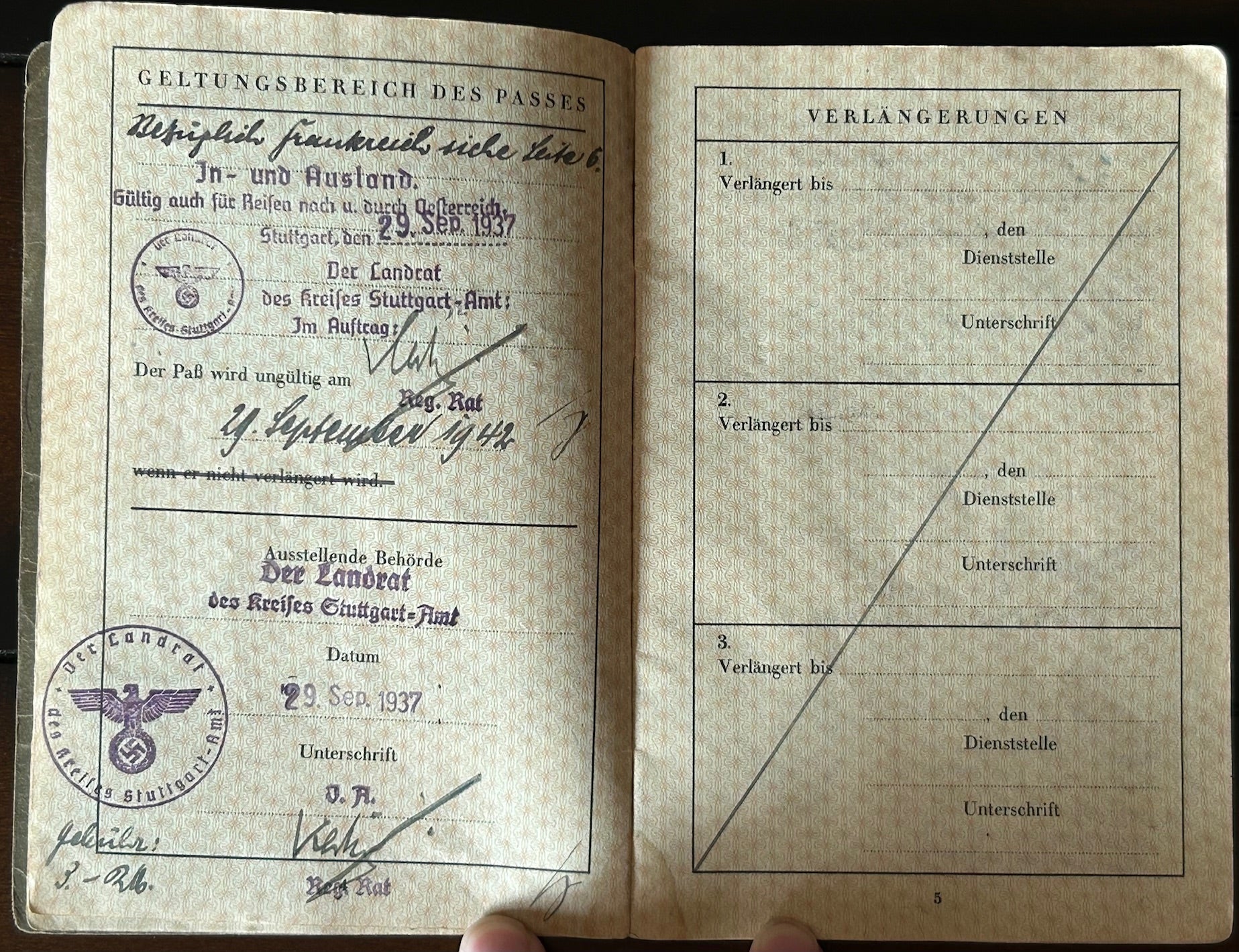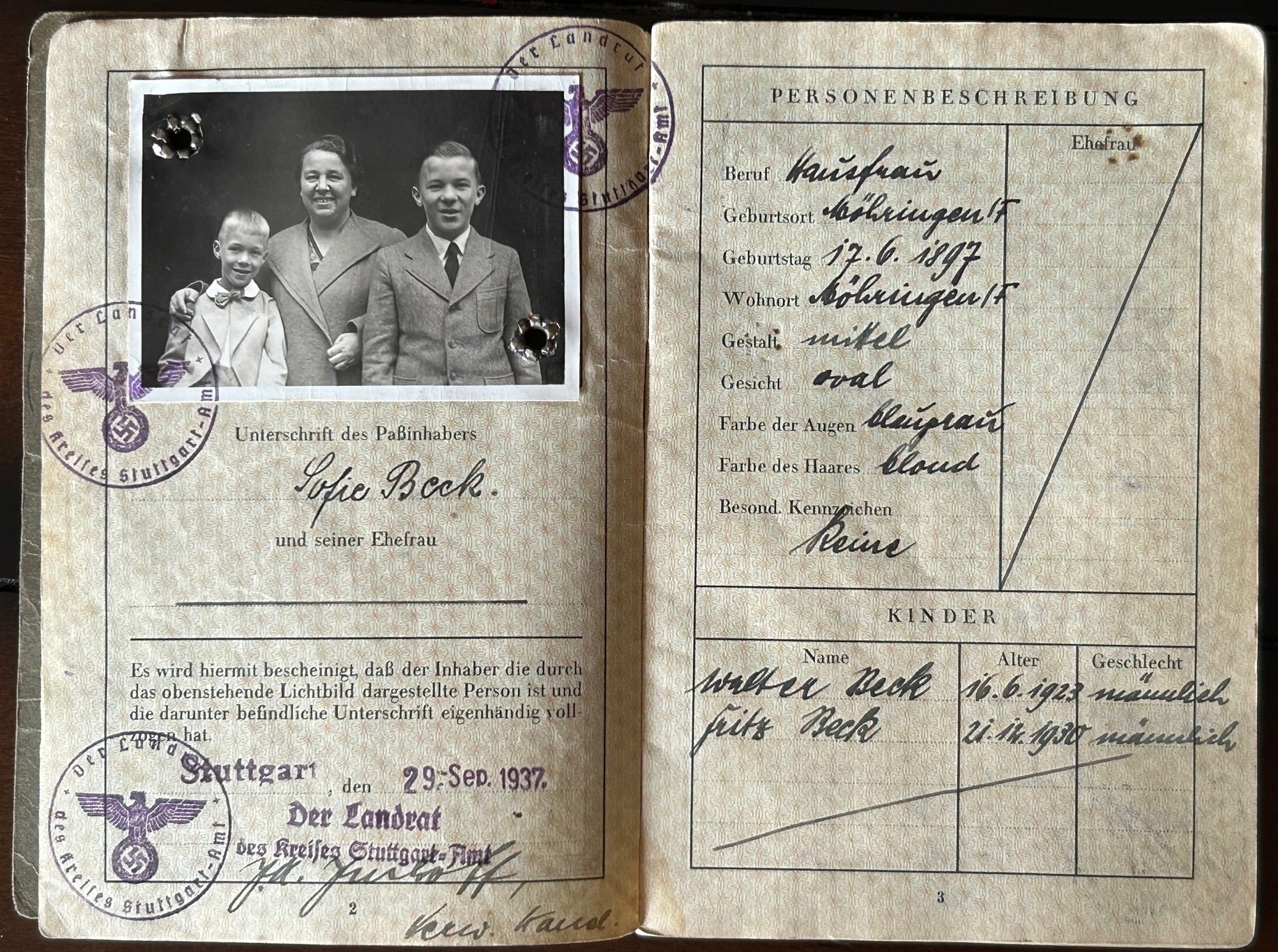 Third Reich-era German passport / reisepass issued to Sofie Beck and her two children in late September 1937. She was born in 1897 and resided around the city of Stuttgart. Her two sons were named Walter (born in 1923) and Fritz (born in 1930). Nice photo of the three of them posing together. Since her children were minors they would be traveling using their parent’s passport. Quite a few stamps and entries in this passport, all but 5 pages have entries, very well travelled family. She appears to have been a very frequent traveller to France until July 1939 (the war put a stop to that). She also travelled several times to Switzerland and Italy, mainly from 1939 to 1941. The front cover is partly denazified (pencilled over Hakenkreuz), but the stamps are not, with one exception on the first page. Nice family passport, I’ve rarely handled an example that is as well filled-in as this one.
