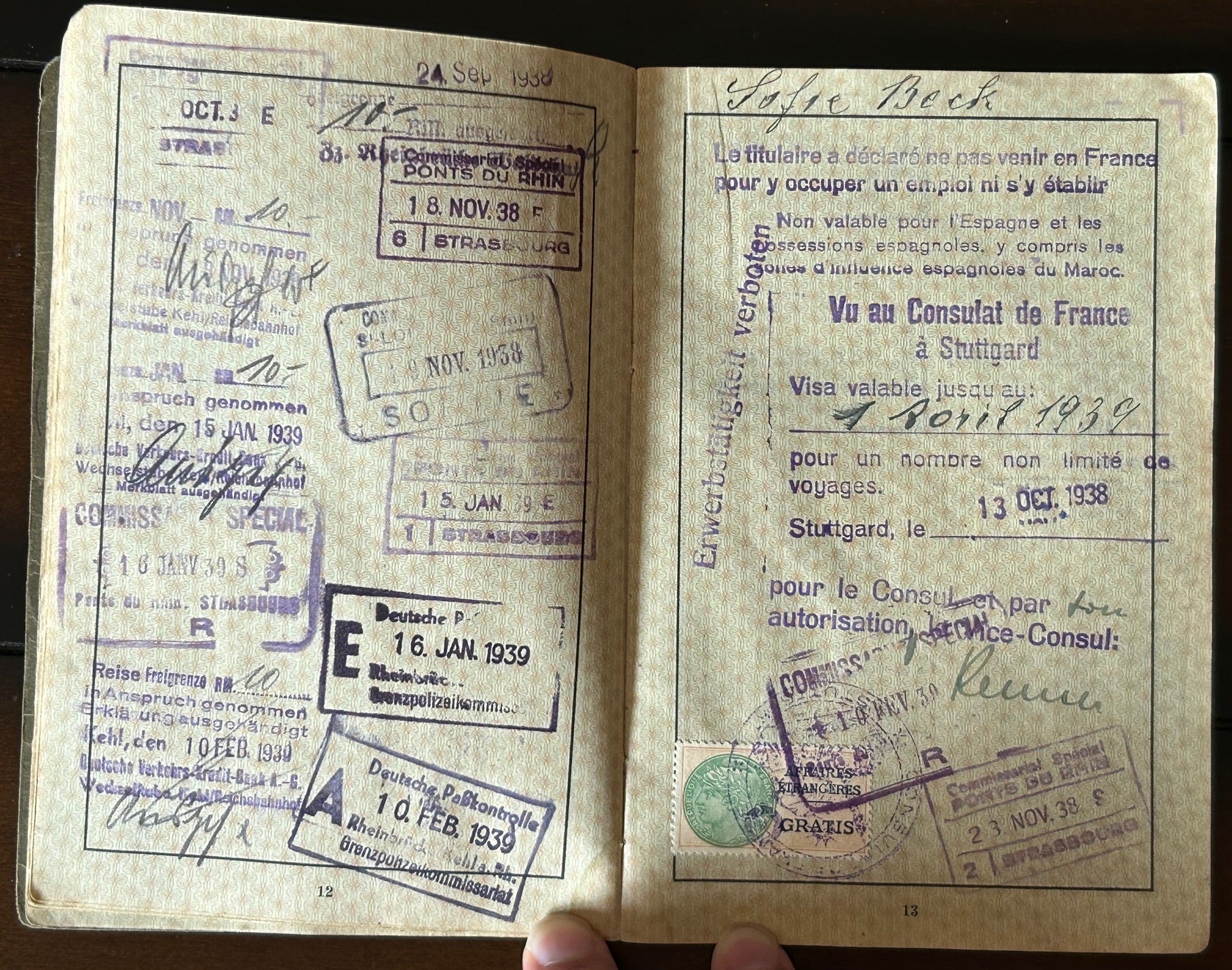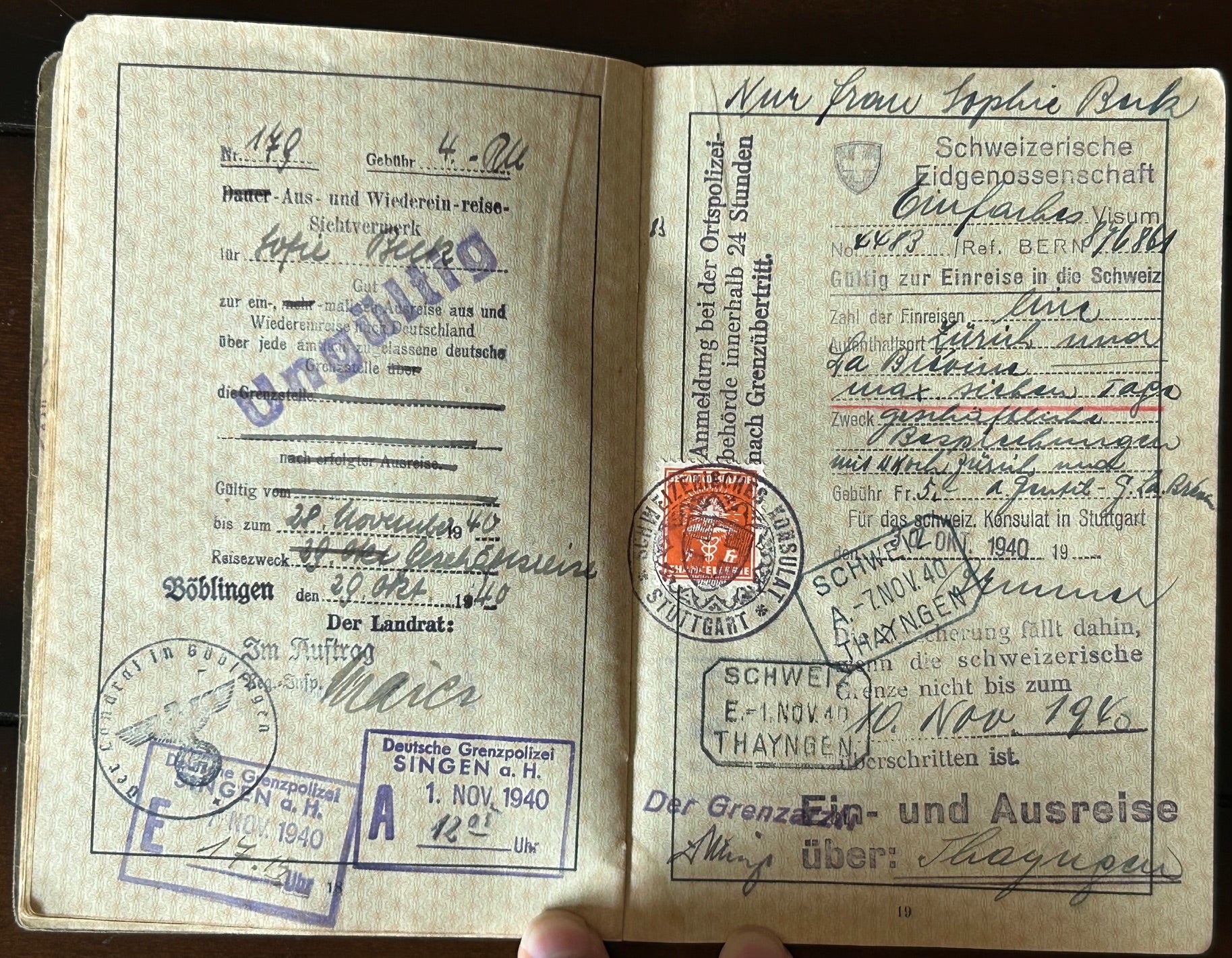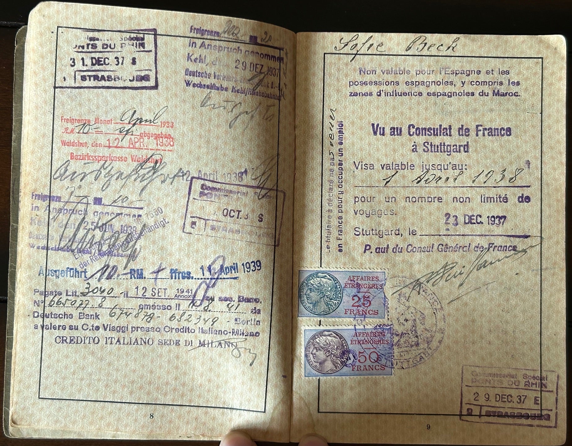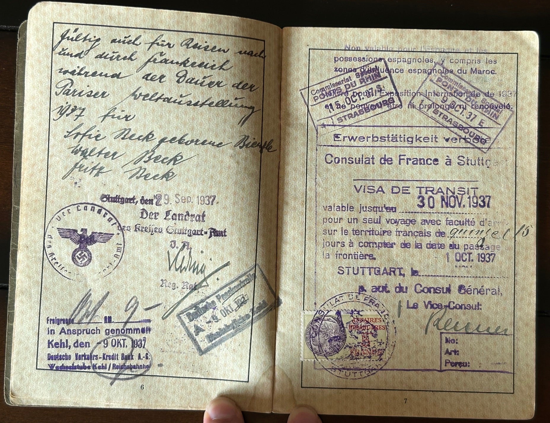 Third Reich-era German passport / reisepass issued to Sofie Beck and her two children in late September 1937. She was born in 1897 and resided around the city of Stuttgart. Her two sons were named Walter (born in 1923) and Fritz (born in 1930). Nice photo of the three of them posing together. Since her children were minors they would be traveling using their parent’s passport. Quite a few stamps and entries in this passport, all but 5 pages have entries, very well travelled family. She appears to have been a very frequent traveller to France until July 1939 (the war put a stop to that). She also travelled several times to Switzerland and Italy, mainly from 1939 to 1941. The front cover is partly denazified (pencilled over Hakenkreuz), but the stamps are not, with one exception on the first page. Nice family passport, I’ve rarely handled an example that is as well filled-in as this one.
