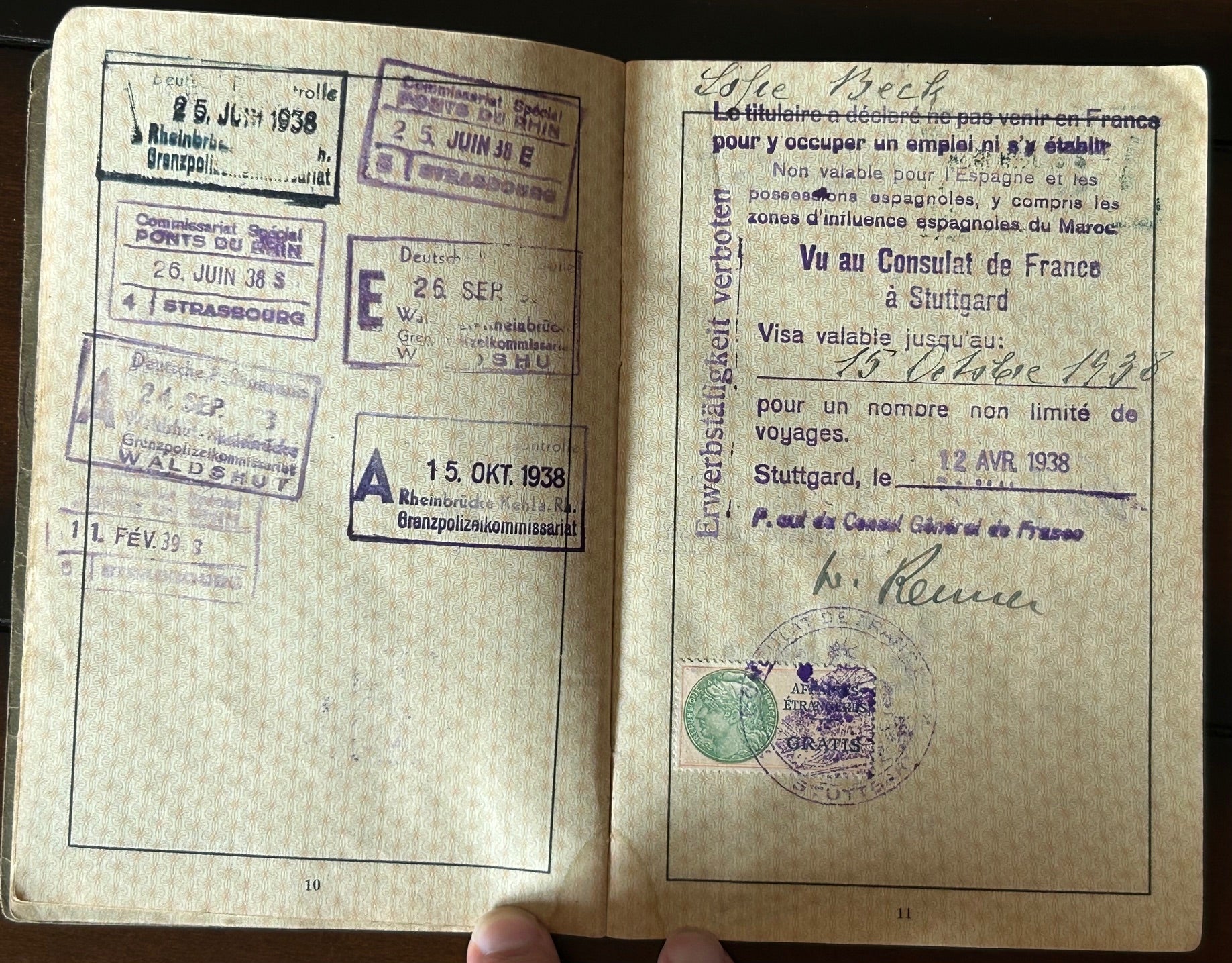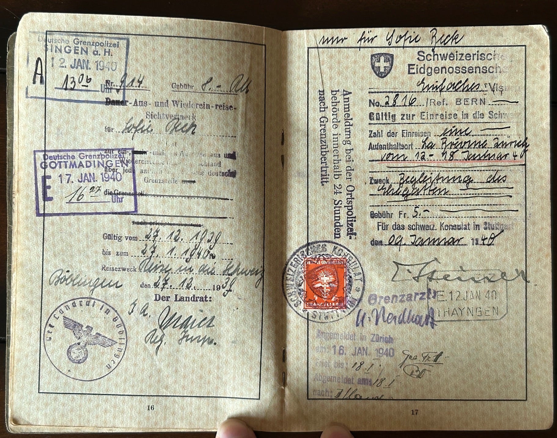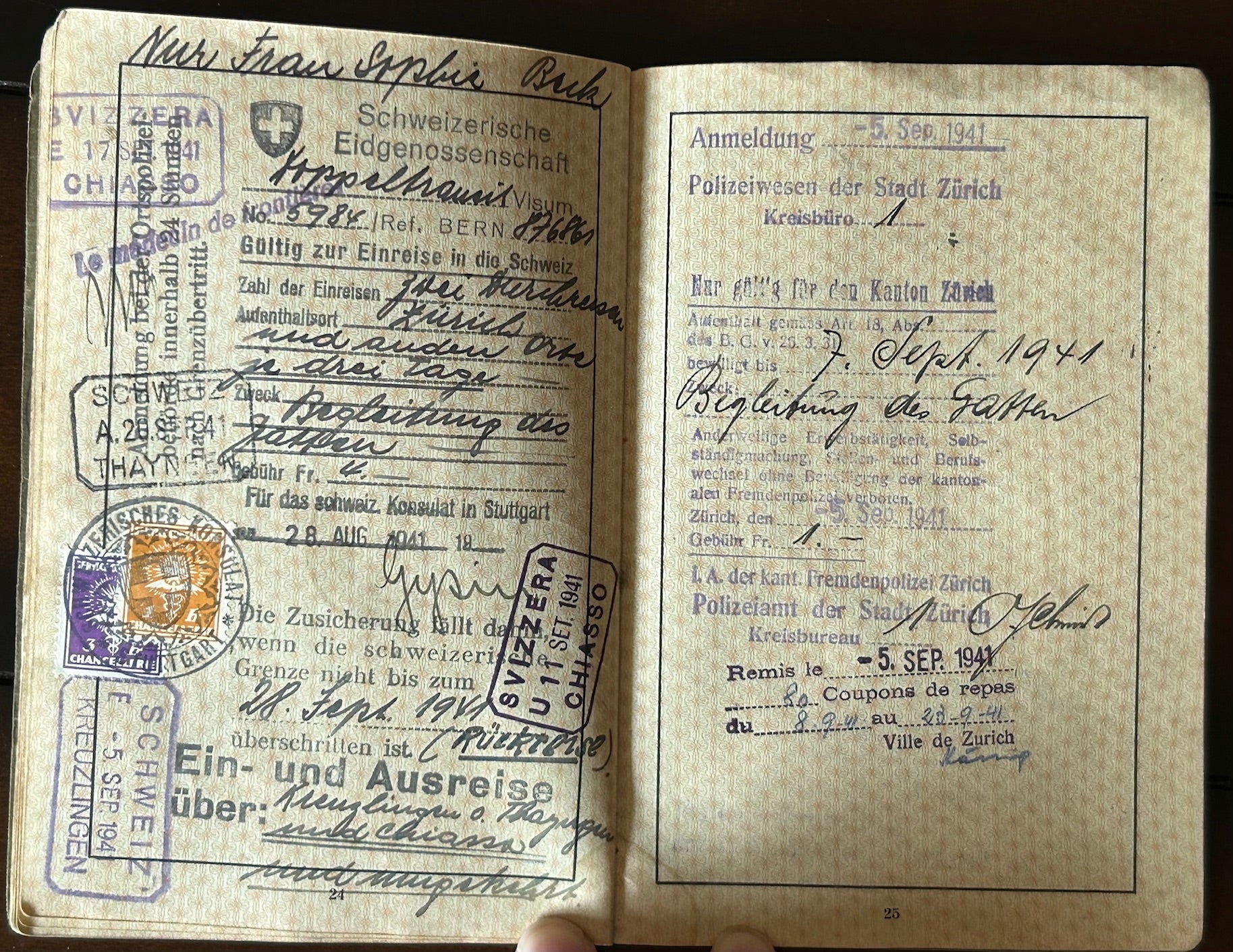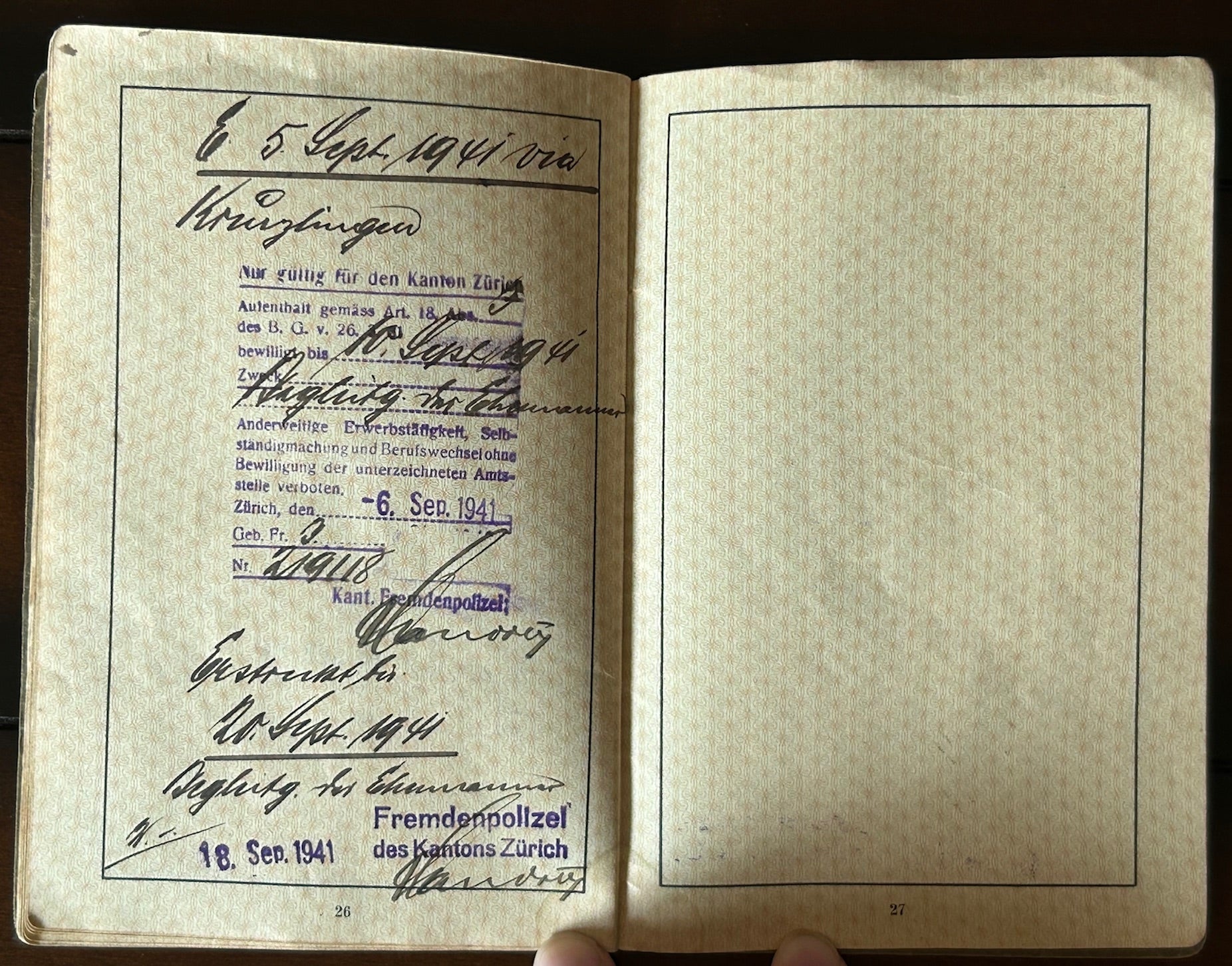 Third Reich-era German passport / reisepass issued to Sofie Beck and her two children in late September 1937. She was born in 1897 and resided around the city of Stuttgart. Her two sons were named Walter (born in 1923) and Fritz (born in 1930). Nice photo of the three of them posing together. Since her children were minors they would be traveling using their parent’s passport. Quite a few stamps and entries in this passport, all but 5 pages have entries, very well travelled family. She appears to have been a very frequent traveller to France until July 1939 (the war put a stop to that). She also travelled several times to Switzerland and Italy, mainly from 1939 to 1941. The front cover is partly denazified (pencilled over Hakenkreuz), but the stamps are not, with one exception on the first page. Nice family passport, I’ve rarely handled an example that is as well filled-in as this one.