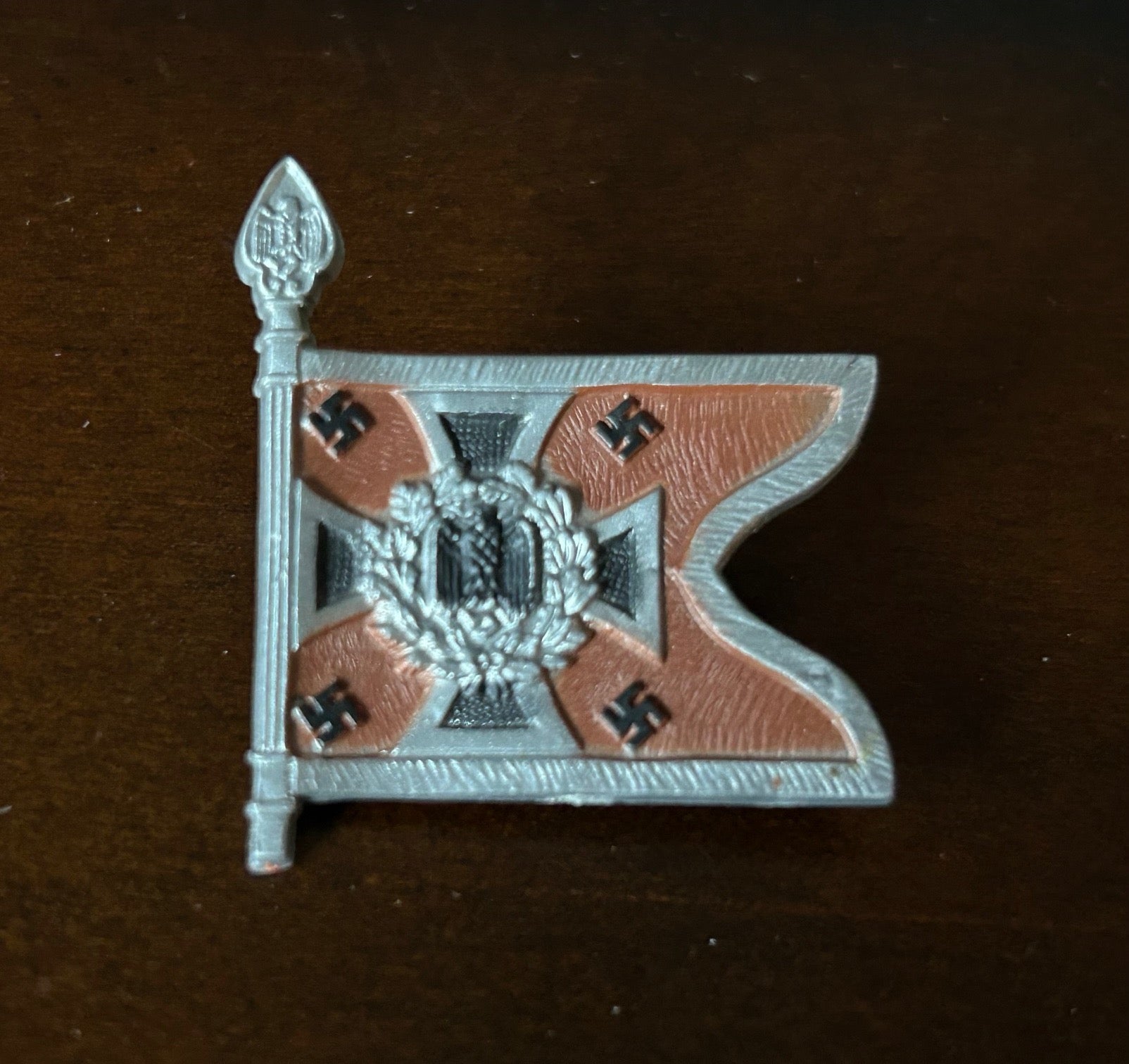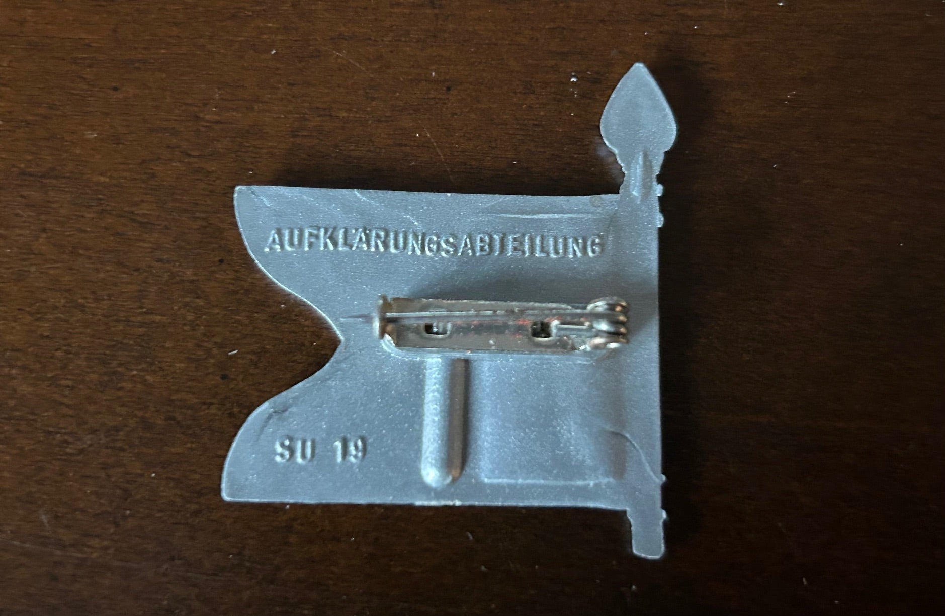 WW2-period, German collectible badge / tinnie, depicting the standard (pennant) of the Auflarungsabteilung (reconnaissance troops). Made of plastic-resin, original metal pinback device attached to the reverse. Maker marked SU 19 and the word Auflarungsabteilung. In very good condition.