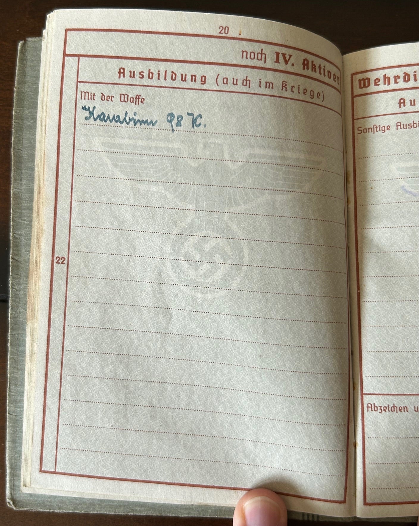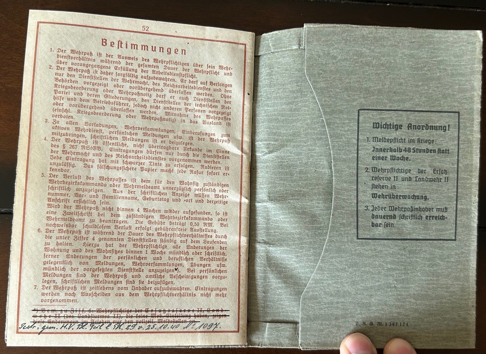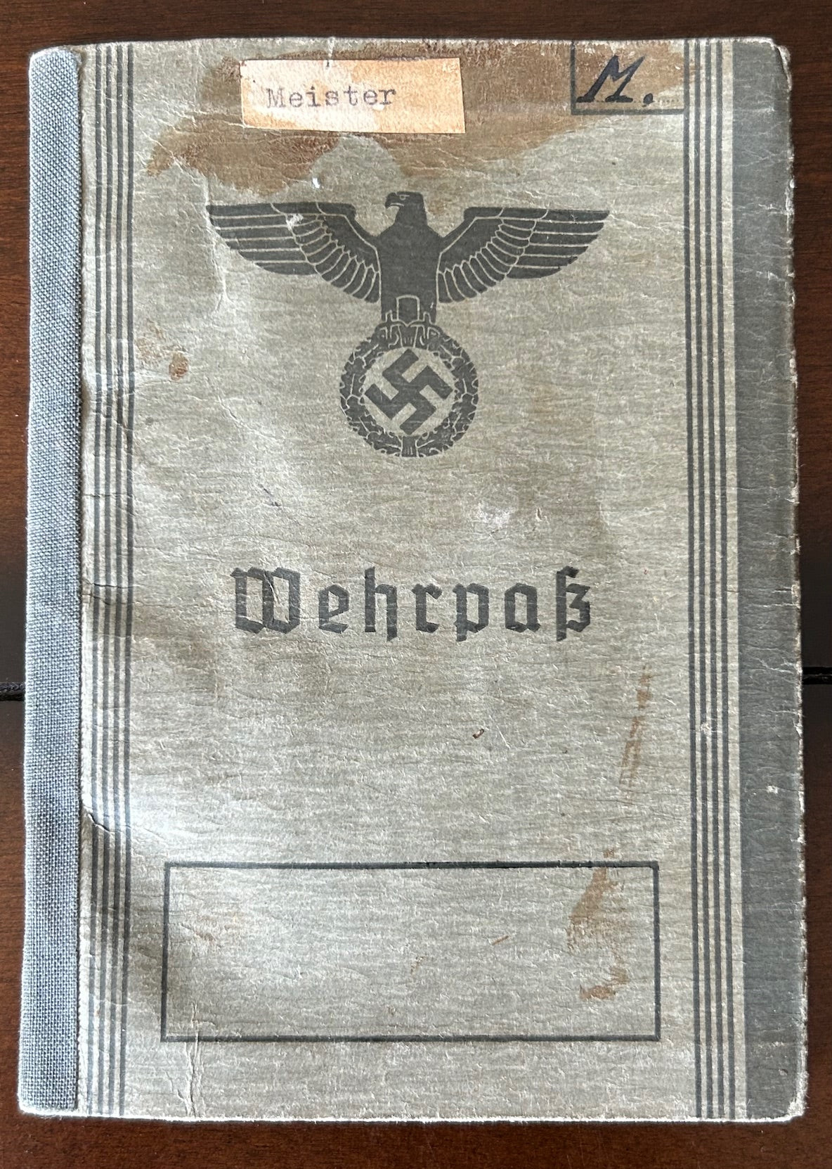 2nd edition Wehrpass issued to Georg Meister, who was born in September 1899, around the town of Hof. He appears to have worked as a stonecutter / mason. He was drafted into the Luftwaffe on April 7th 1942. He served with a logistics / supply unit, namely Nachschubkompanie d. Lw. 21/XI. According to the entries, he served with this same unit from April 1942 until May 5th 1945, finishing the war in the area of Hamburg. He served in occupied France, starting in early May 1942, serving in the “Luftwaffe’s campaign against England” (Einsatz im Operationsgebiet Westfrankreich im Kampf d. Luftwaffe gegen England). There’s an interesting authorization stamp bearing a Paris based Luftwaffe HQ stamp (Lg. V.A. Paris L 43850). He was trained to use the standard Gewehr 98k rifle. He was promoted to Gefreiter in April 1943 and Obergefreiter in May 1944. A little spartan with entries, but an interesting Luftwaffe Wehrpass for a support soldier who served in occupied France.