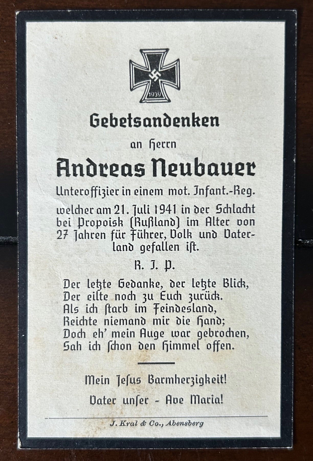 WW2 period German “Death Card”, single-pannel, for Andreas Neubauer, an NCO (Unteroffizier) in motorized infantry regiment (Mot. Infant.-Reg.). He was killed around the city of Propoisk, Belarus, in late July 1941.