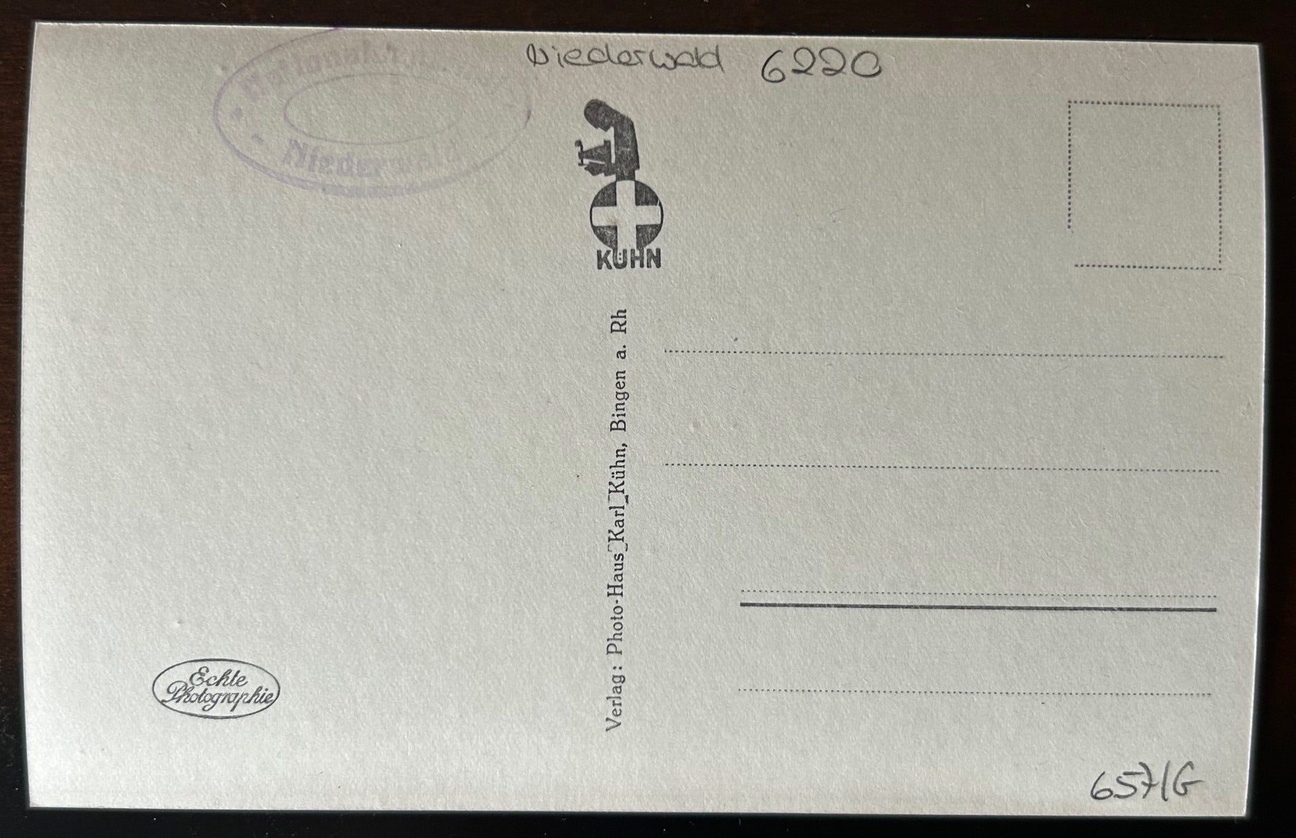 Late 1920’s / early 1930’s photographic postcard of a zeppelin airship flying over the Rhine river (printed caption on the front). Printed by a small photo studio in the town of Bingen am Rhein. Hasn’t been mailed or filled-in, faint studio / property stamp on the reverse. In very good condition.