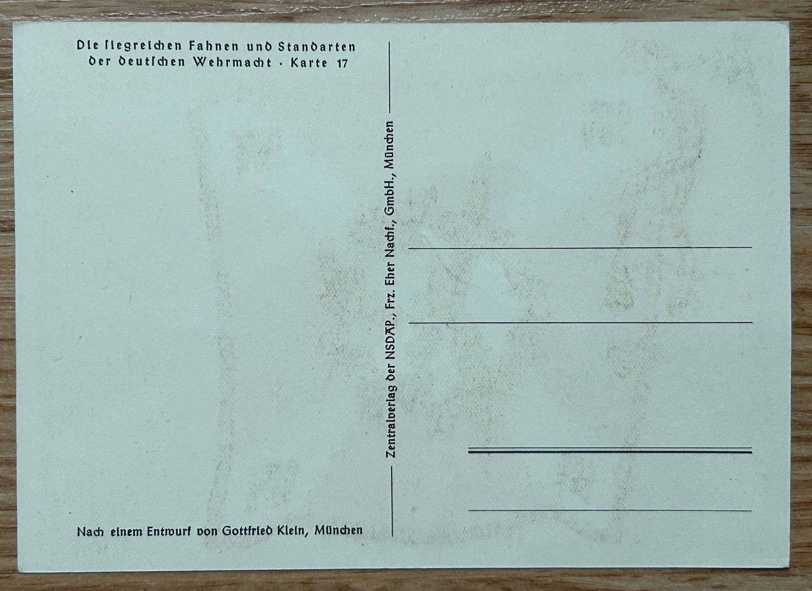 Third Reich era German artwork postcard, part of a series of art by Gottfried Klein (numbered Karte 17 on the reverse) depicting the various branches of the Wehrmacht’s standards / service flags (Die fliegreichen Fahnen und Standarten der Deutschen Wehrmacht). Shows a little wear and age, but overall in good condition, very eye-catching, displays nicely.