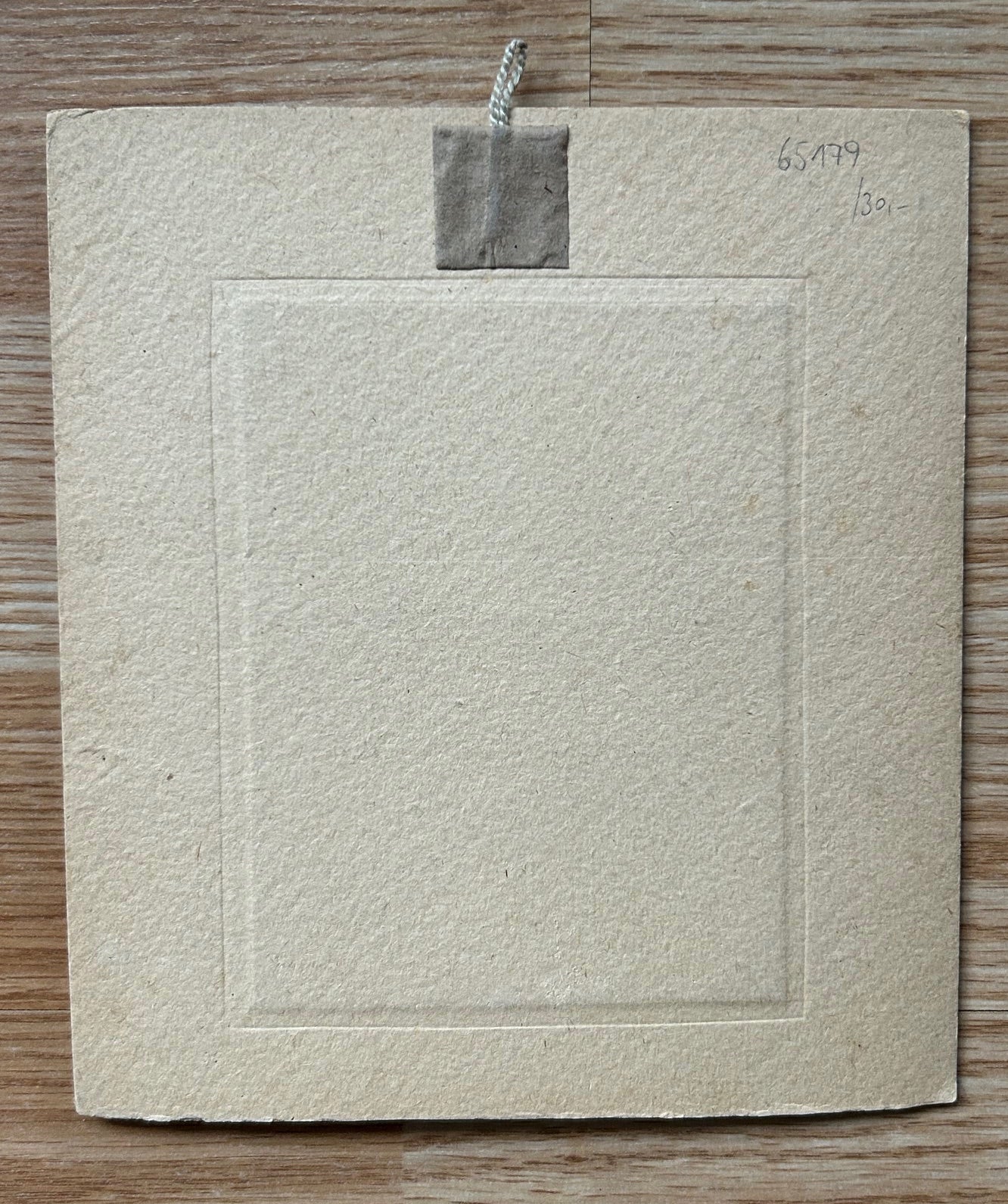 Portrait photograph of Adolf Hitler giving a speech at a podium. Cardboard casing with attachment string to hang on a wall. The photo itself measures around 12.5cm x 9.5cm, would display nicely.