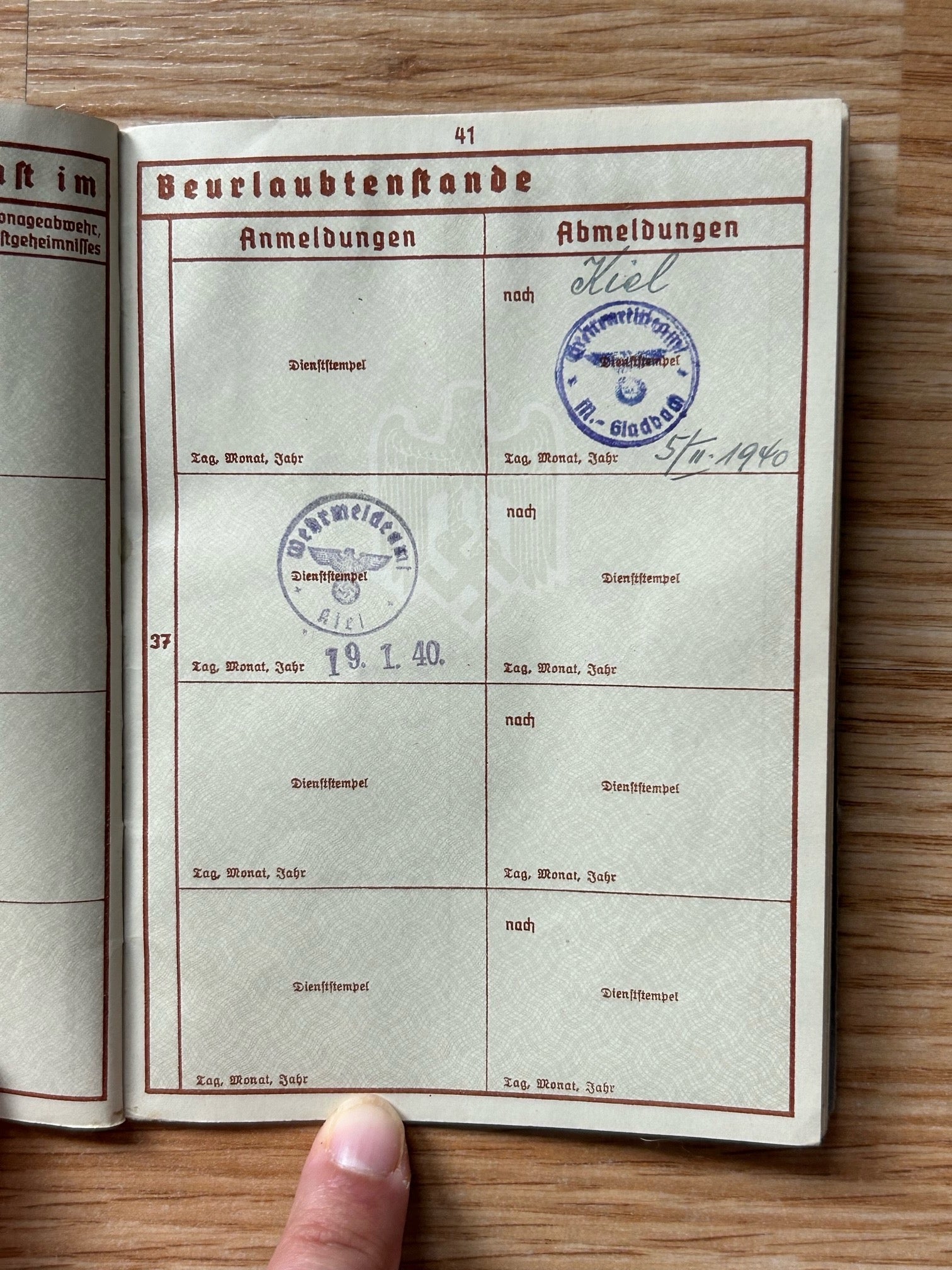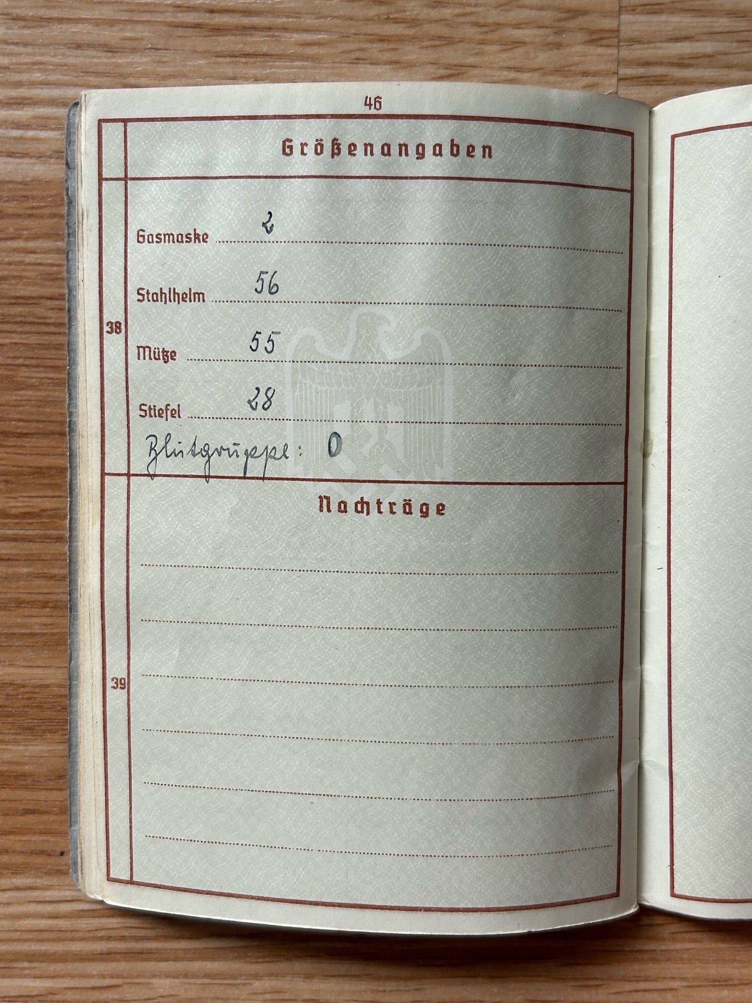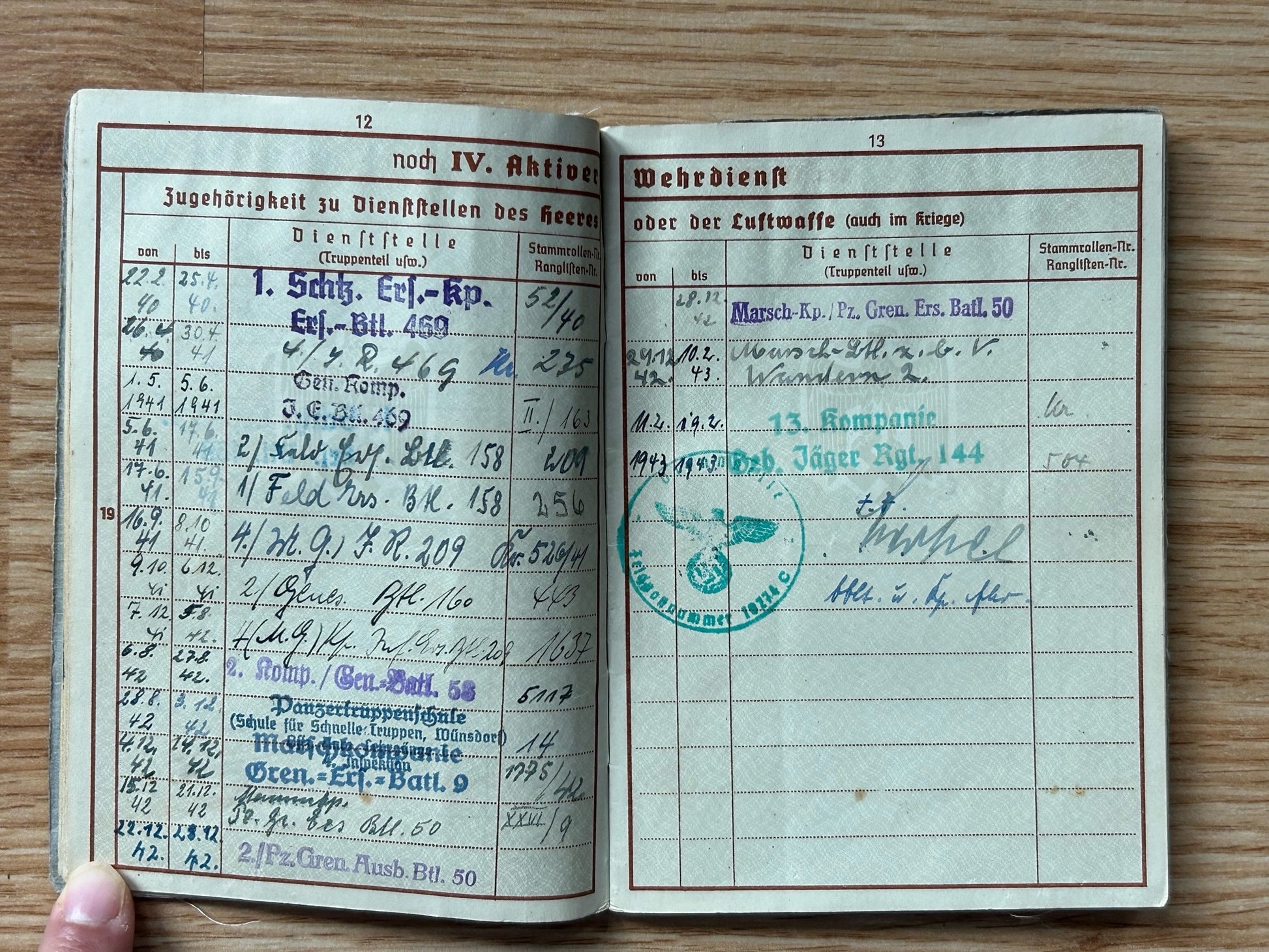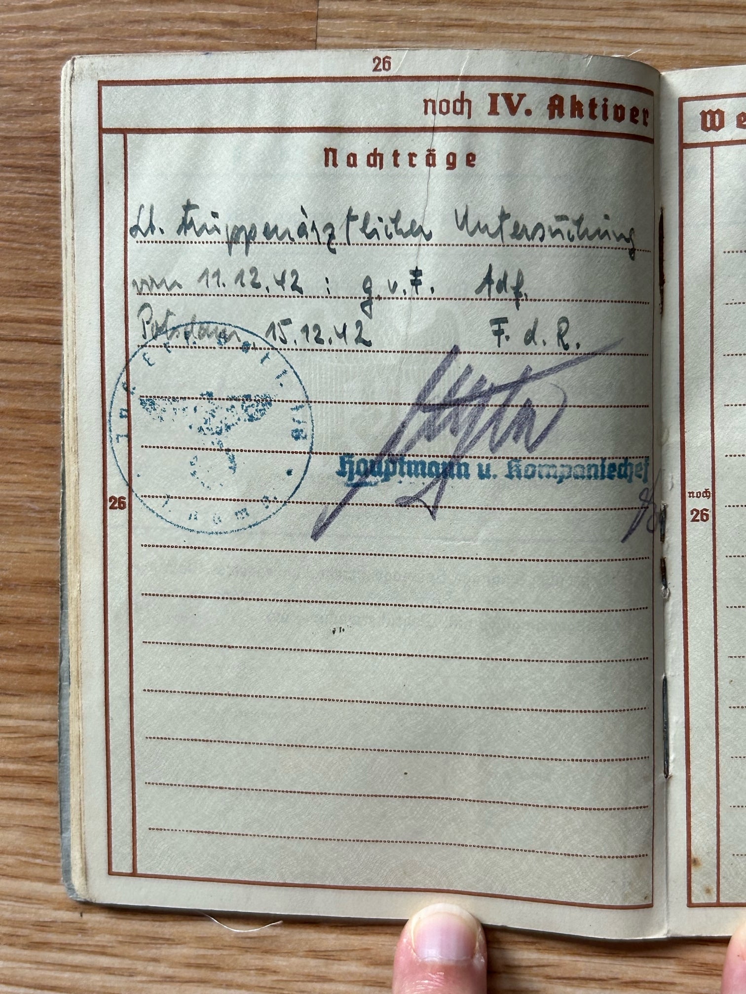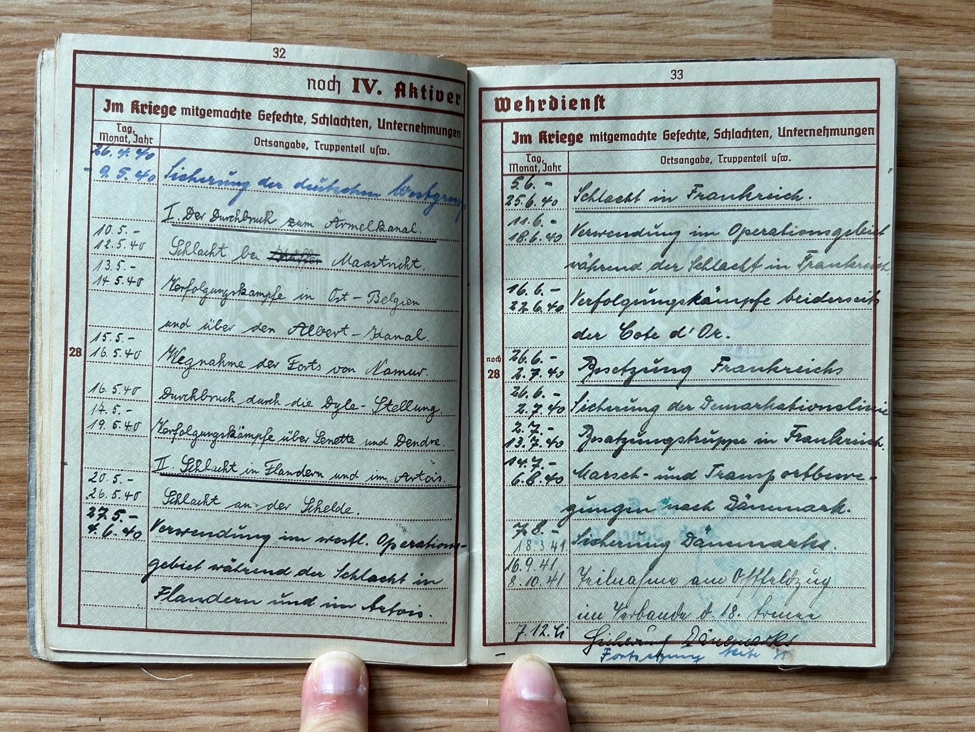 His combat record shows that he fought in a series of battles from early May to late June 1940, fighting through Belgium into Northern France (combat along the Albert Canal, crossing the Scheldt, Flanders and Artois, etc). He served in occupied France until July 1940, then serving in Denmark (Sicherung Dänemark) from July 1940 until late 1941. Unfortunately further combat history (on the Eastern Front) isn’t recorded in the Wehrpass.