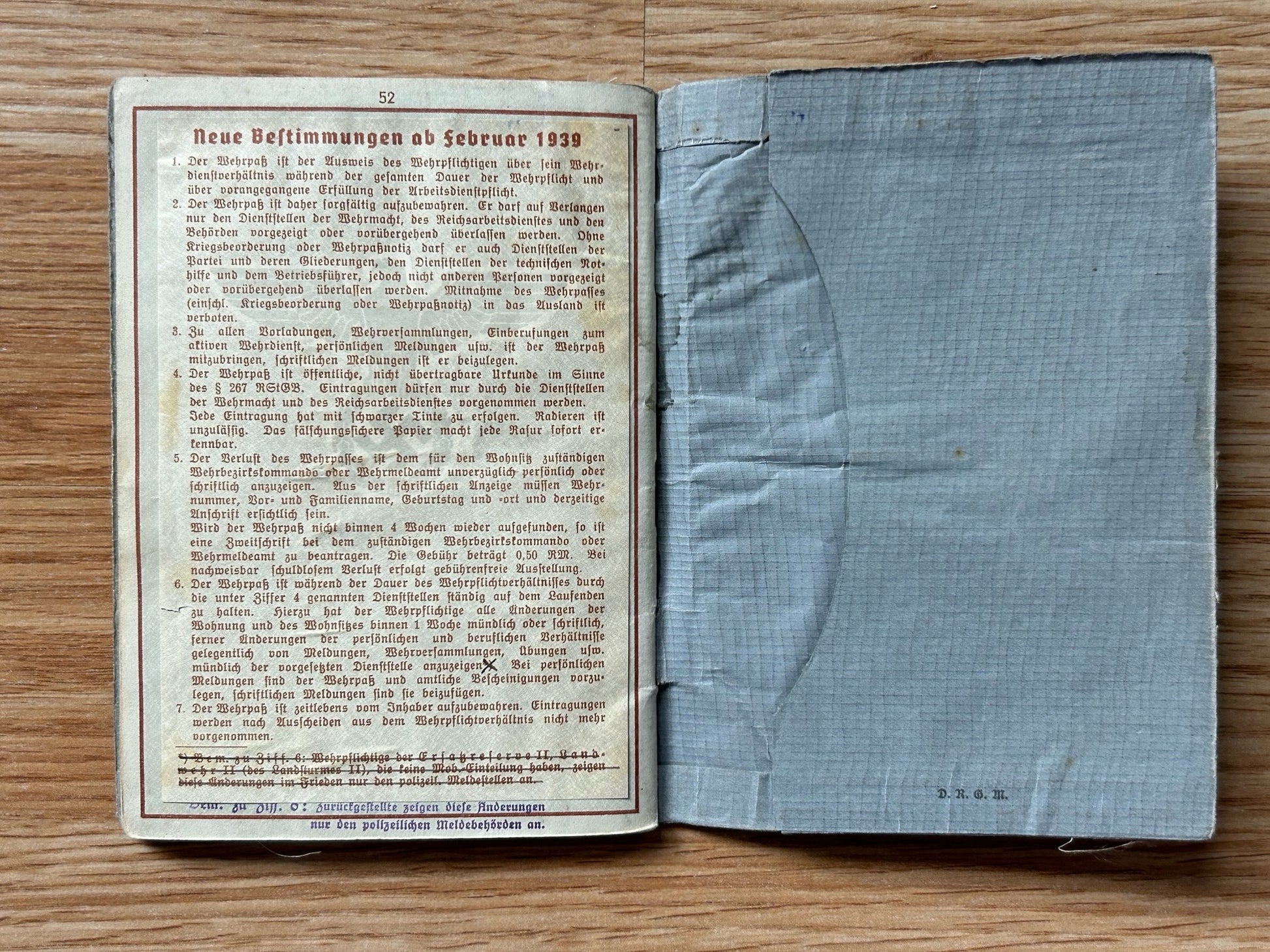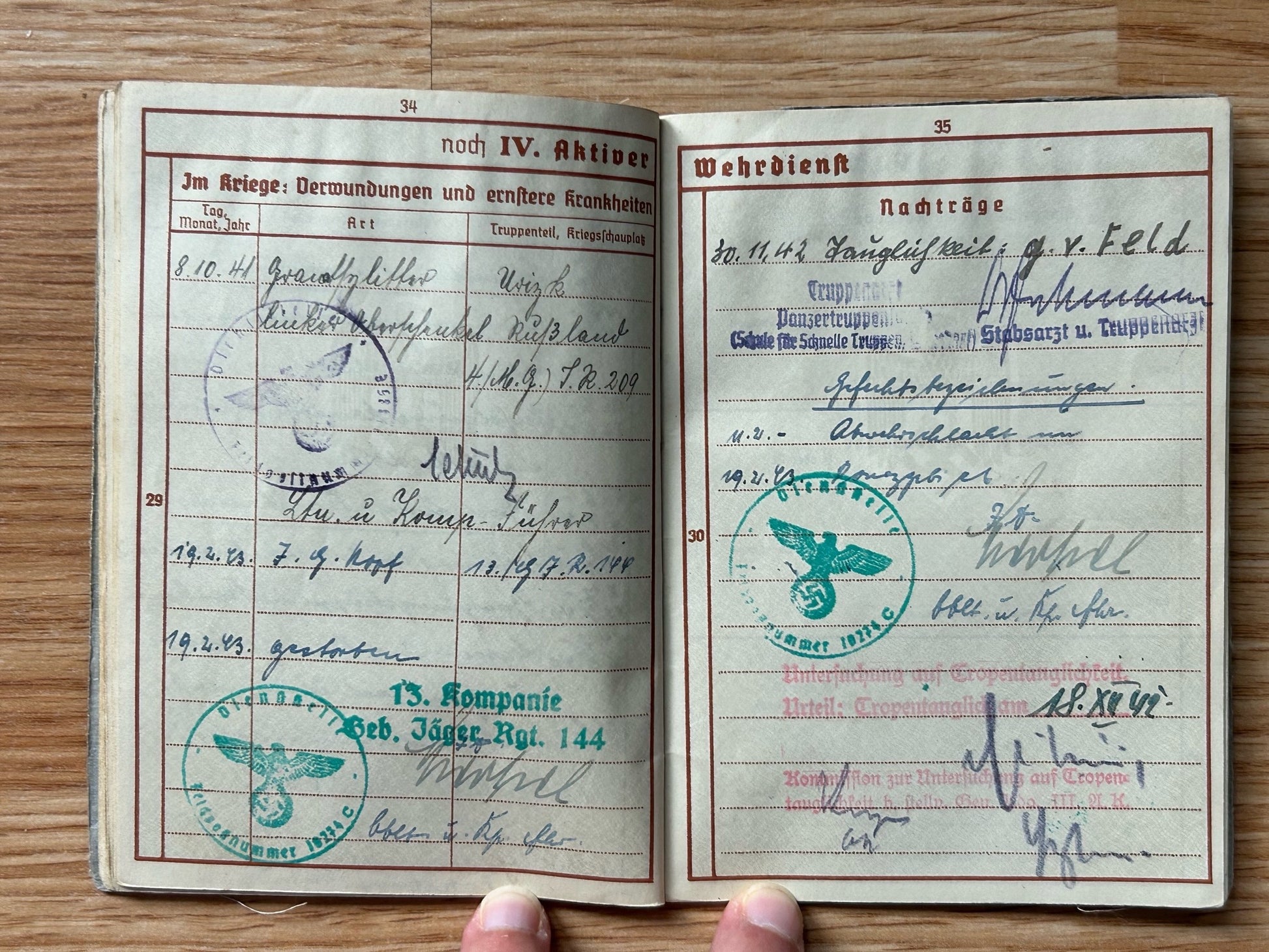 Shows wear and age, but no damage, all pages present, spine isn’t fragile, no loose pages. All stamps and entries photographed. Interesting Wehrpass for a KIA soldier who served as both a panzer grenadier and a mountain trooper.