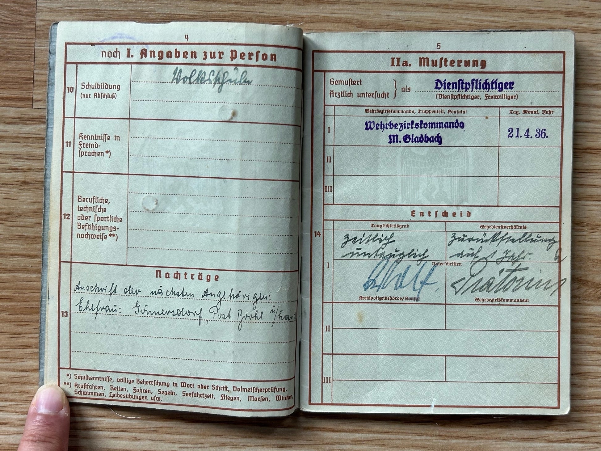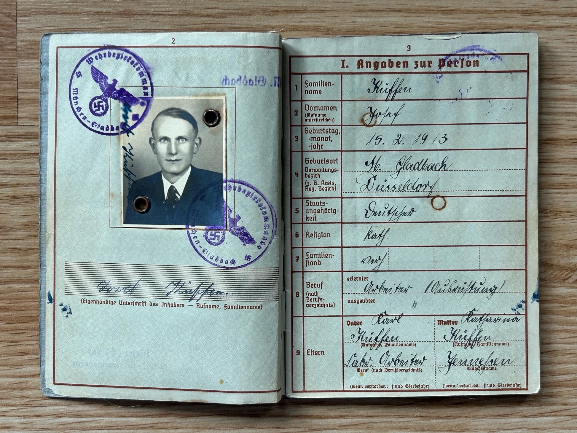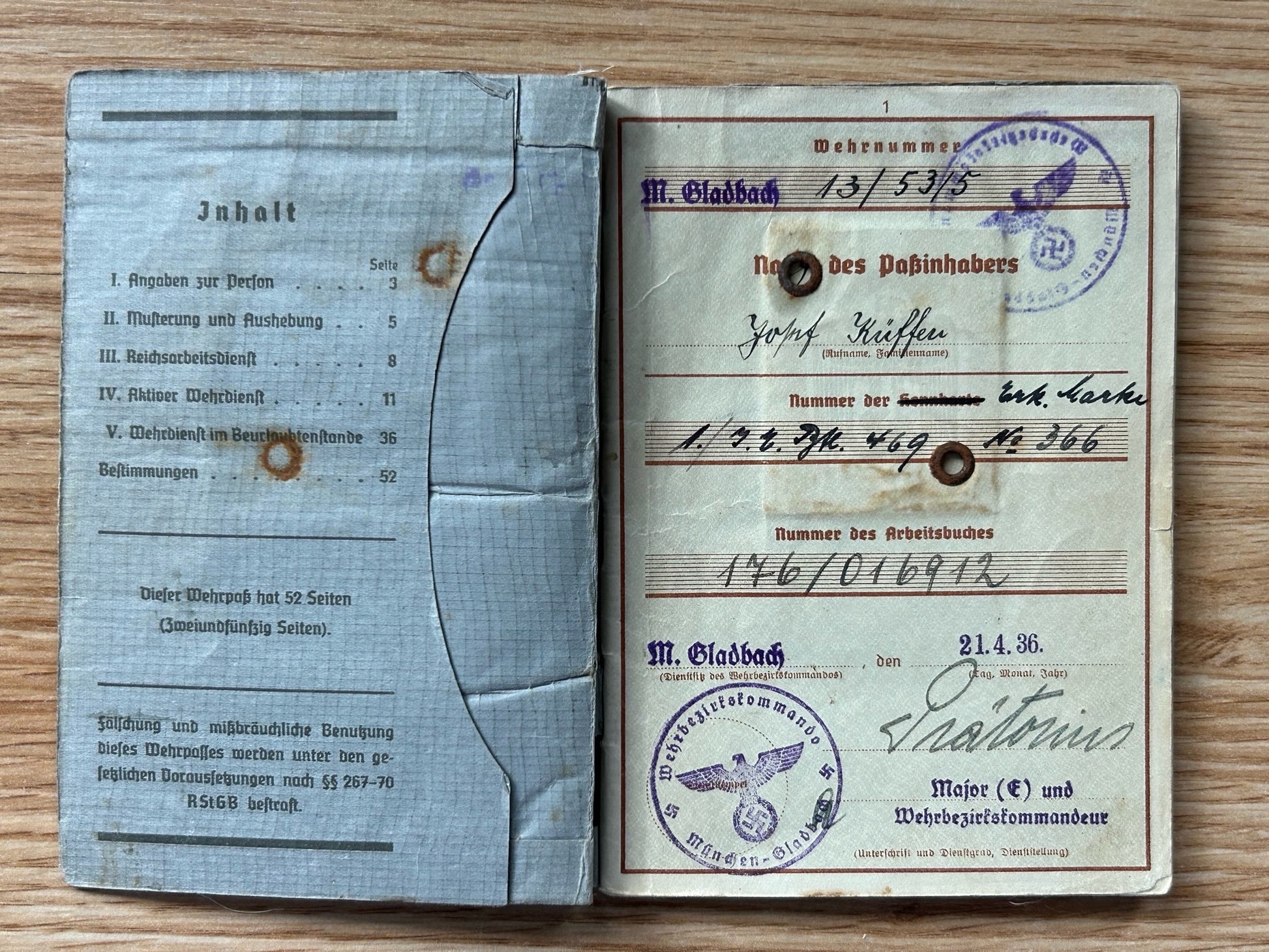 1st edition Wehrpass for Josef Küffen, born in 1913 in Mönchengladbach. The Wehrpass was issued in April 1936. He was inducted into the Wehrmacht in late February 1940, first serving with 1. Schtz. Ers.-Kp. Ersatz Battalion 469, from Feb to March 1940. He served with various infantry units, including Infanterie Regiment 209 from May 41 to August 42. He trained at Panzertruppenschule Wünsdorf in August 1942, transfering afterwards to several panzer grenadier battalions ( Panzer Grenadier Ersatz Battalion 9 and 2. / Pz. Gren. Ausb. Btl. 50). He later served with Gebrigsjäger Regiment 144 in February 1943. He was killed a few days later, on Feb 19th 1943.