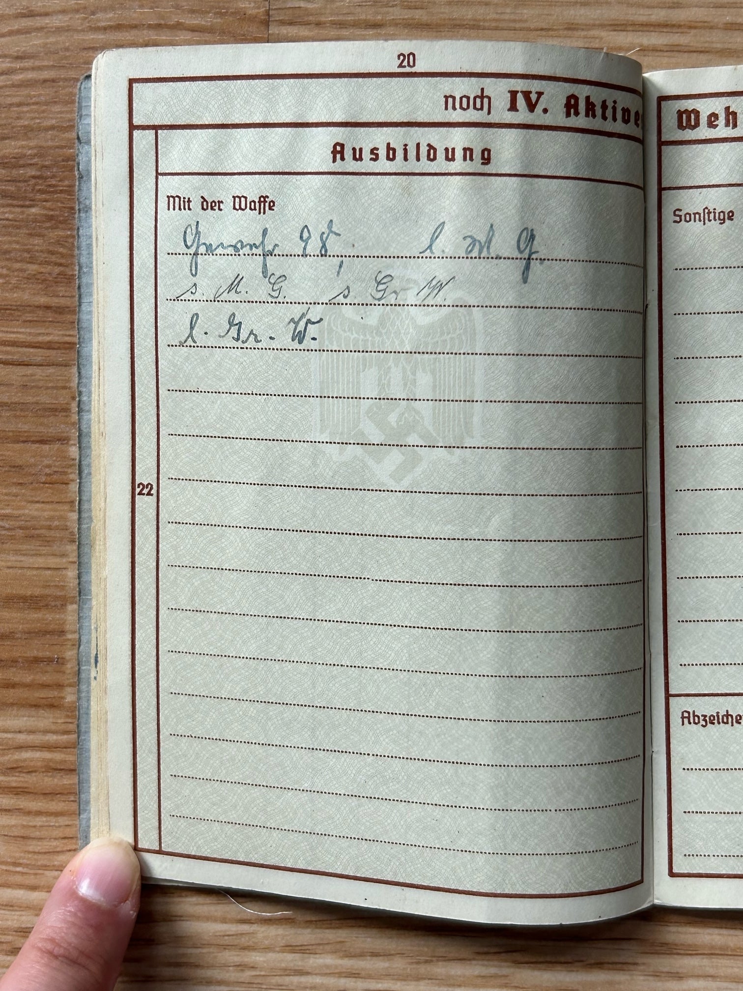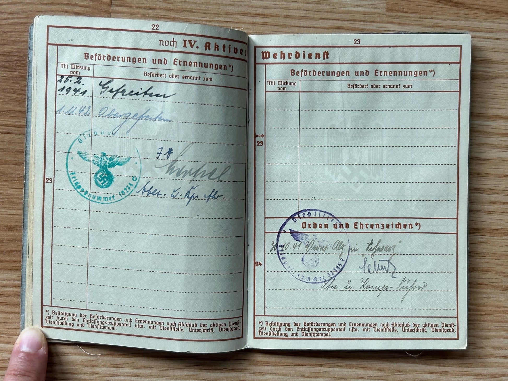 His Wehrpass indicates that he was trained to use the standard Gewehr 98k rifle, light and heavy machine guns and the light 5cm mortar (l. Gr. W.). His final rank was Obergefreiter (promoted in Nov 42). He was awarded the Wound Badge in Black (Verw. Abz. in Schwarz) in Oct 41 for a shrapnel wound that he sustained fighting on the Eastern Front, as a member of infanterie regiment 209.